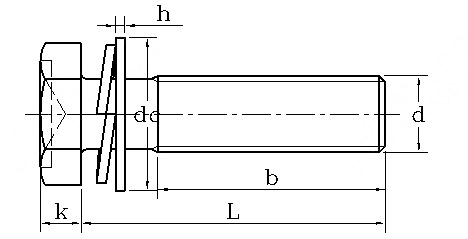 常用十字槽凹穴六角頭螺栓、彈簧墊圈和平墊圈組合件是指帶十字槽外六角螺栓彈平墊組合螺絲。簡稱組合螺栓。國標號為GB9074.12.還有一另常用的外六角組合螺絲,國標號為GB9074.17.是指切邊外六角組合螺絲。也就是說不帶十字的外六角組合螺栓。